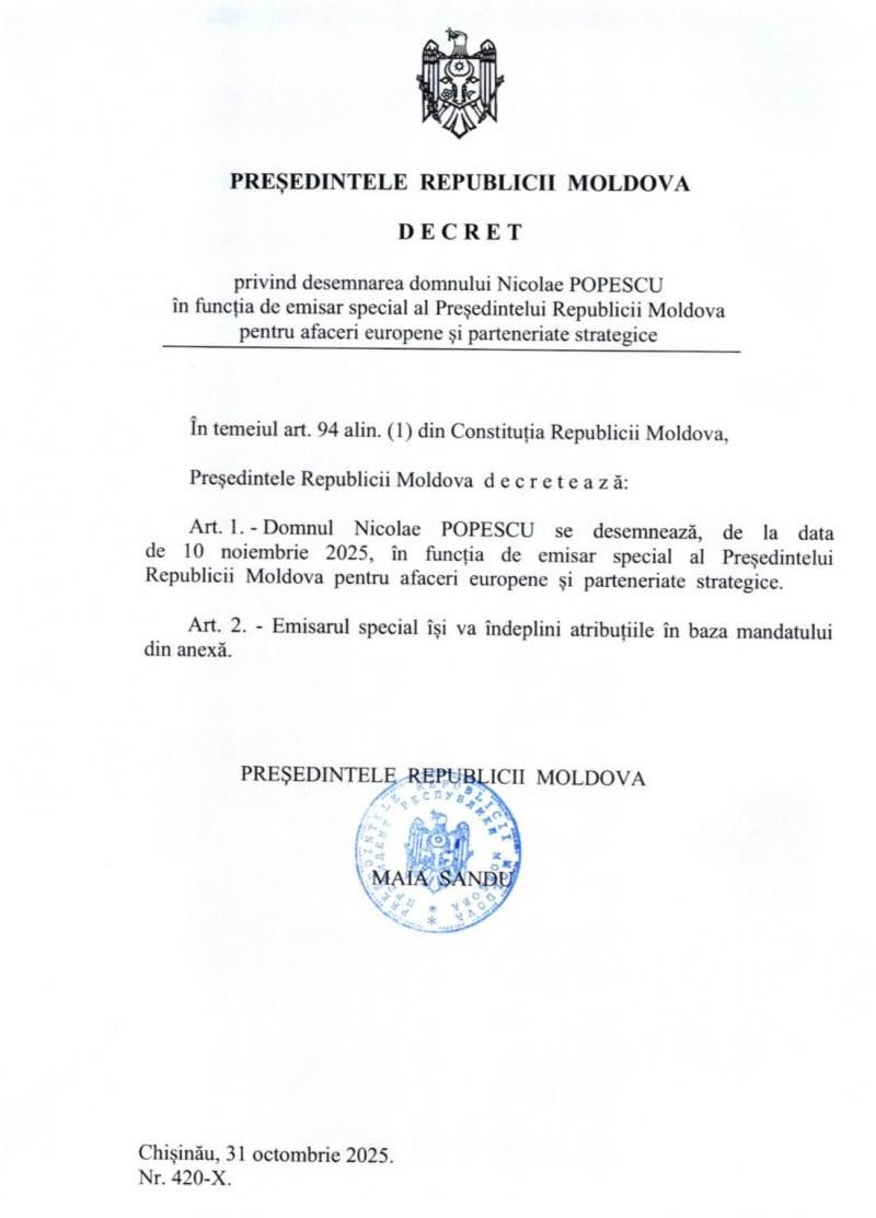 „Pentru a contribui în continuare la procesul de aderare la UE și la consolidarea sprijinului european pentru Republica Moldova, renunț la mandatul de deputat și preiau poziția de Emisar special pentru afaceri europene și parteneriate strategice. În acest rol mă voi concentra pe dialogul politic și pe parteneriatele necesare cu instituțiile UE, cu statele membre, cu parlamentari, cu media și mediul cultural, precum și cu partenerii strategici ai Moldovei”,a scris Nicu Popescu pe Facebook.