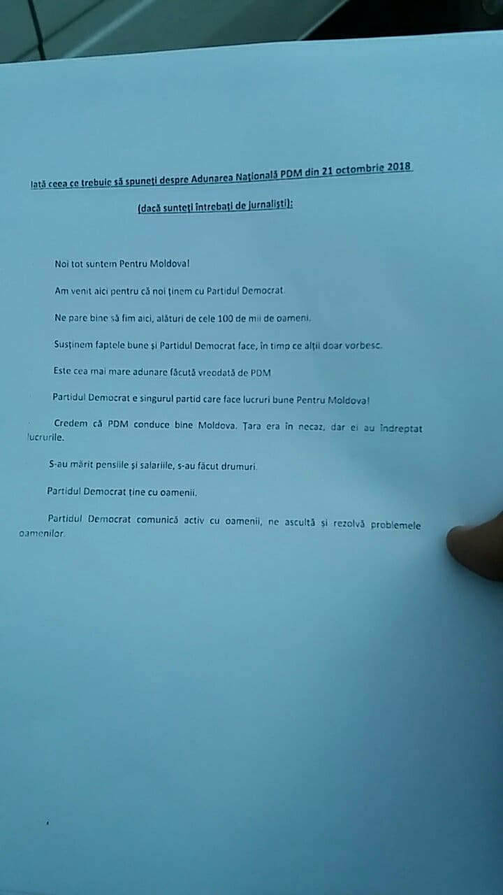 Mai multor persoane prezente la Adunarea Partidului Democrat le-au fost impartite de organizatorii evenimentului pliante informative despre ce ar trebui sa raspunda jurnalistilor, scrie ZdG.md