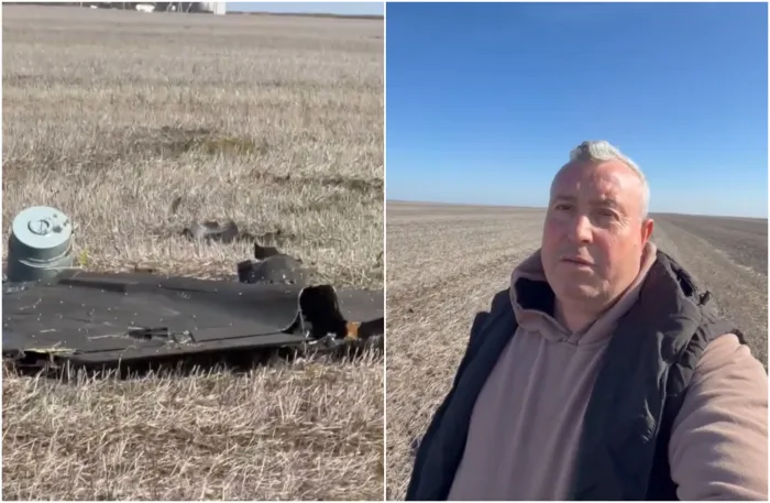 „Azi este 17 martie, marți. Mă deplasam să văd câmpurile, cum este buruianul, când mă uit văd că am un cadou… cadou de la Putin sau de la altcineva. Iată motorul, cu patru cilindri, bunișor, cu magneți. Și iată drona, cu explozibil în frunte. Mai încolo fragmente căzute. Uite drona, e neagră și nu scrie nimic pe ea. Priviți, bună bombă are. Nu departe e gospodăria mea”, a relatat fermierul.
