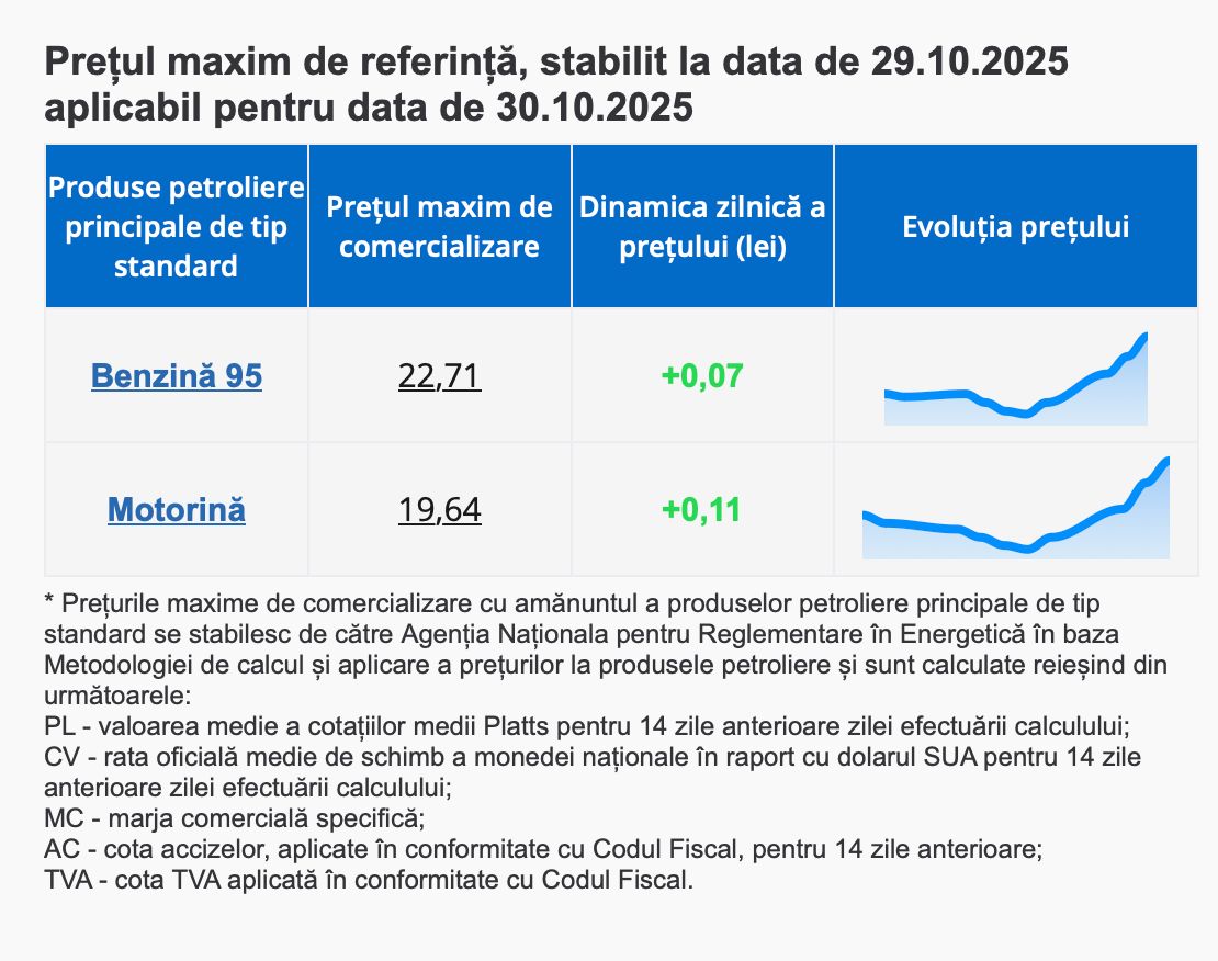 Potrivit Agenției Naționale pentru Reglementare în Energetică, mâine benzina va fi la preț de 22,71 lei pentru un litru, iar motorina va fi la preț de 19,64 lei pentru un litru.
