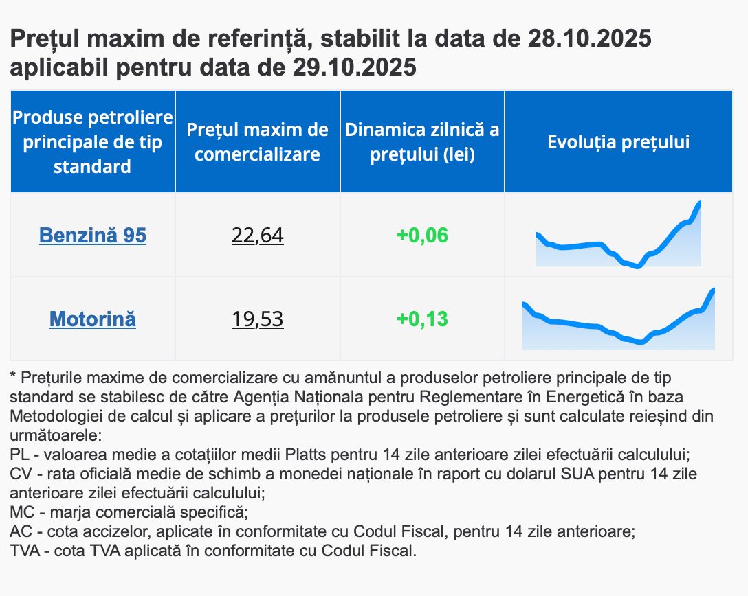 Potrivit Agenției Naționale pentru Reglementare în Energetică, mâine benzina va fi la preț de 22,64 lei pentru un litru, iar motorina va fi la preț de 19,53 lei pentru un litru.
