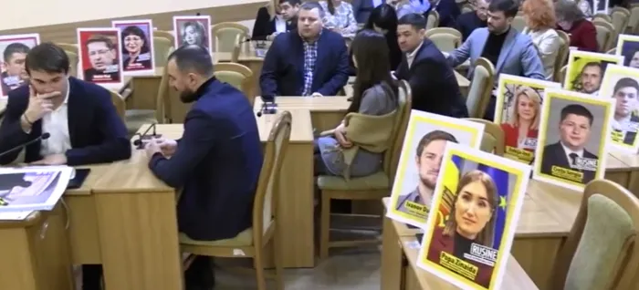 Ulterior, fotografiile consilierilor de la Pas și PSRM expuse în fața clădirii primăriei, au ajuns în sala de ședințe pe locul unde unde ar fi trebuit să stea consilierii.
