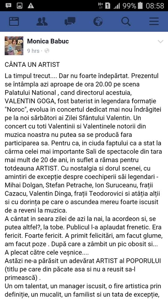 Aseara, Valentin Goga, a cantat pe scena alaturi de orchestra Fluieras la un concert dedicat zilei indragostitilor. Fiind in trecut tobosar, el a interpretat mai multe piese la acest instrument. Organizatorii sustin ca la final a fost aplaudat frenetic. Martorii presupun ca din cauza emotiilor i s-ar fi facut rau. Printre spectatori a fost si ministrul Culturii, Monica Babuc, care a asistat la scena tragica.