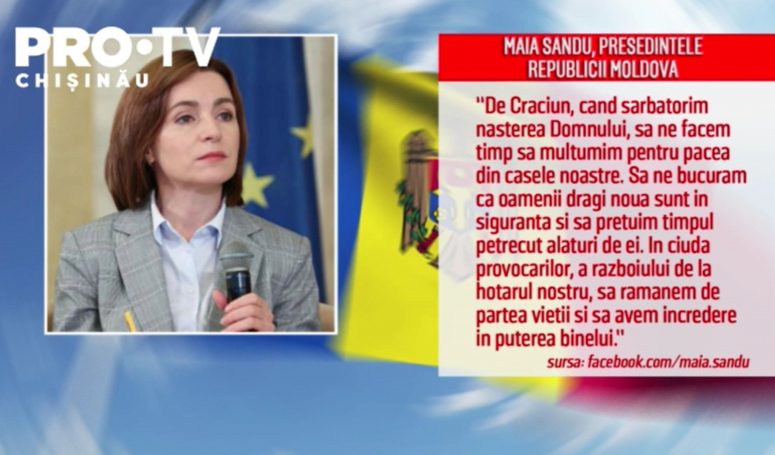 MAIA SANDU, PRESEDINTELE REPUBLICII MOLDOVA: „De Craciun, cand sarbatorim nasterea Domnului, sa ne facem timp sa multumim pentru pacea din casele noastre. Sa ne bucuram ca oamenii dragi noua sunt in siguranta si sa pretuim timpul petrecut alaturi de ei. In ciuda provocarilor, a razboiului de la hotarul nostru, sa ramanem de partea vietii si sa avem incredere in puterea binelui”,a scris presedintele Republicii Moldova in mesajul de Craciun pe pagina sa de Facebook.