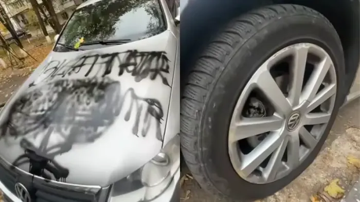 Un incident inedit a avut loc pe strada Ion Doina Aldea-Teodorovici, sectorul Buiucani, unde un șofer s-a trezit dis-de-dimineață cu roțile mașinii dezumflate, iar capota autoturismului era desenată cu graffiti.