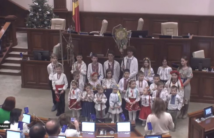 Un grup de copii refugiati din Ucraina i-au colindat astazi pe deputatii moldoveni. Imbracati in straie nationale ucrainene, acestia au venit in plen si i-au urat pe alesii poporului, care i-au rasplatit cu aplauze si multe dulciuri.