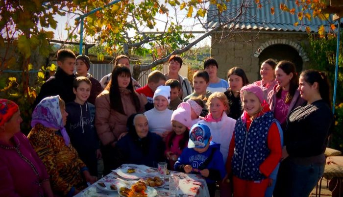 Natalia GÎNGA, REPORTER PRO TV: „Curtea casei mătușii Melania s-a umplut de o bucurie. O buna parte din familia sa numeroasa, adică peste 60 de copii, nepoți și strănepoți au venit sa o viziteze. I-am găsit la masa, uniți și depănând amintiri.”