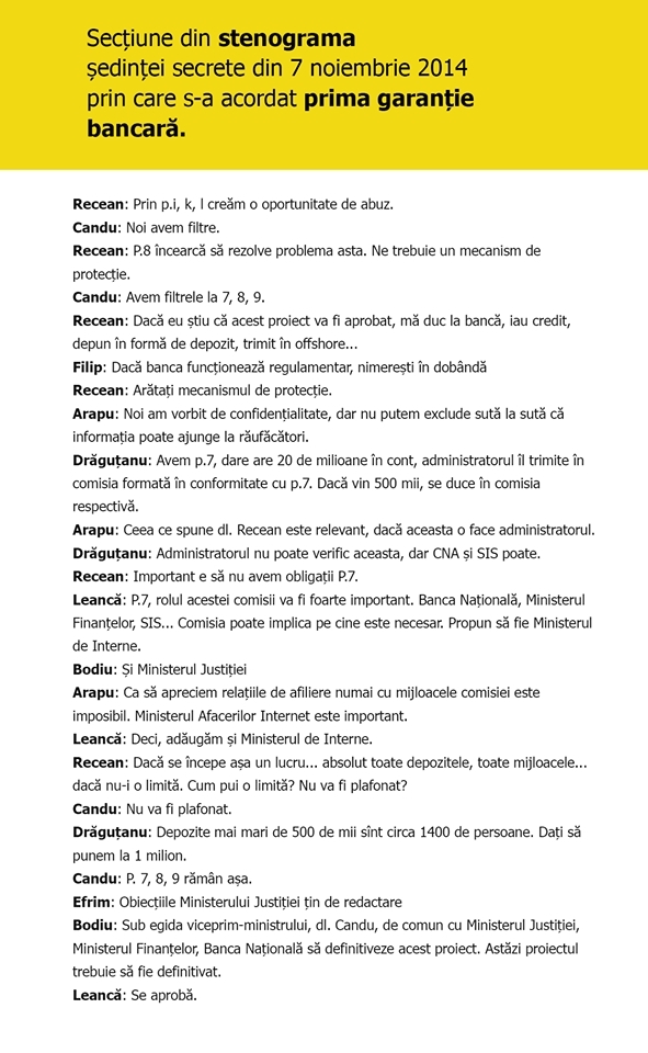 Maia Sandu a publicat pe facebook un schimb de replici si sustine ca aceasta este o parte din discutia participantilor la sedinta secreta din 7 noiembrie 2014, atunci cand Guvernul Leanca a aprobat acordarea primei garantii bancare.