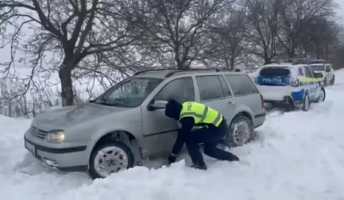 Din imaginile video publicate, putem observa cum polițiștii au ajutat un șofer să iasă după ce a fost blocat în zăpadă pe o șosea din localitatea Sudarca, raionul Dondușeni.