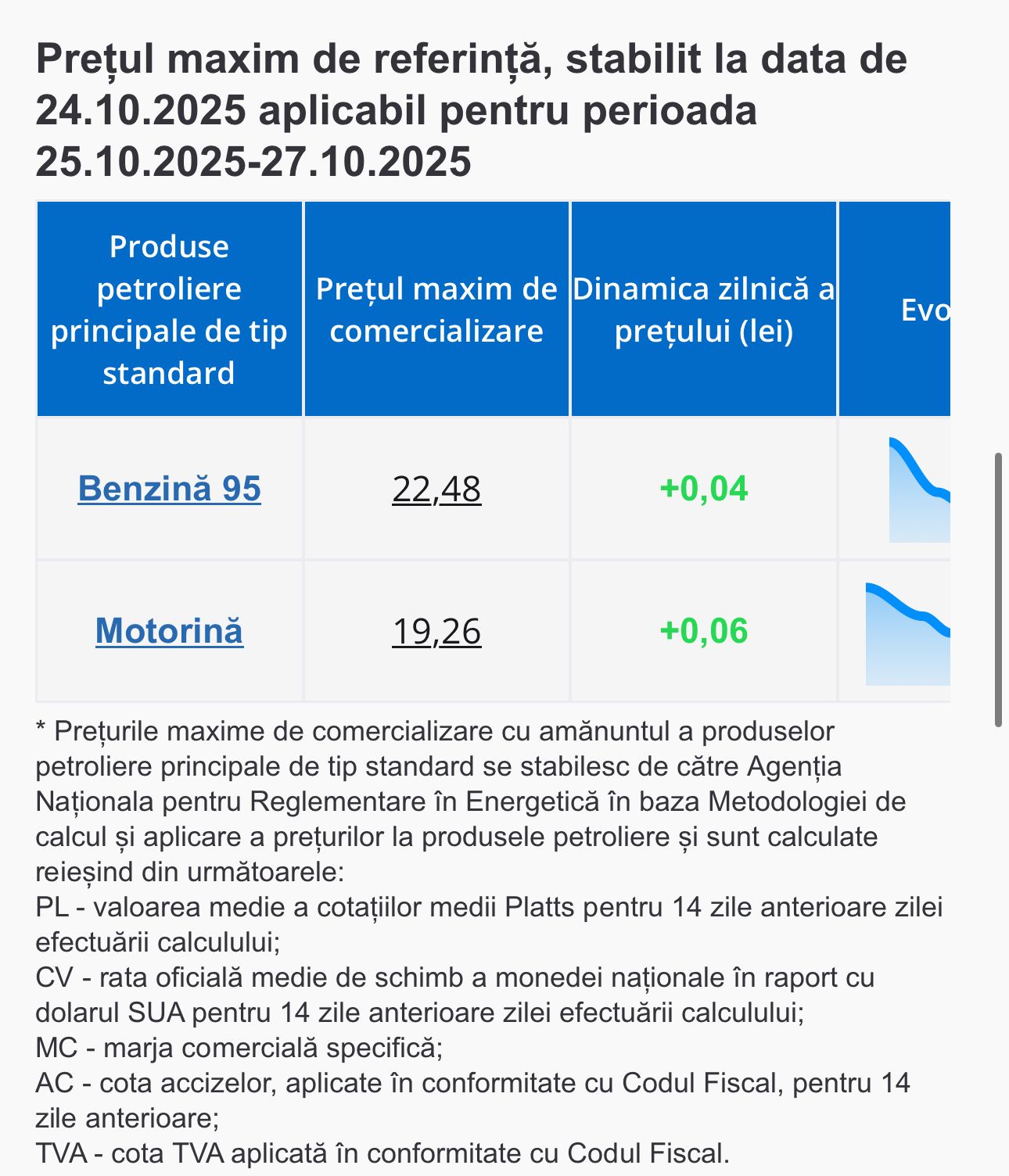 Potrivit Agenției Naționale pentru Reglementare în Energetica, în weekend, dar și luni benzina va fi la preț de 22,48 lei pentru un litru, iar motorina va fi la preț de 19,26 lei pentru un litru.