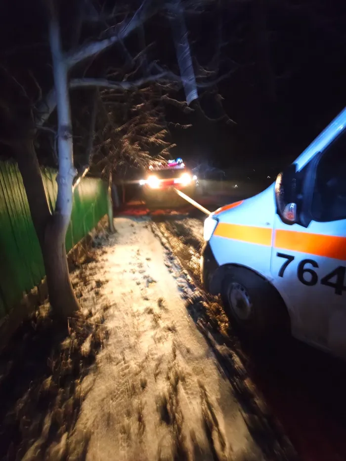 Ambulanța a rămas blocată, iar salvatorii au tractat-o. La scurt timp, echipa de medici a ajuns la chemare.