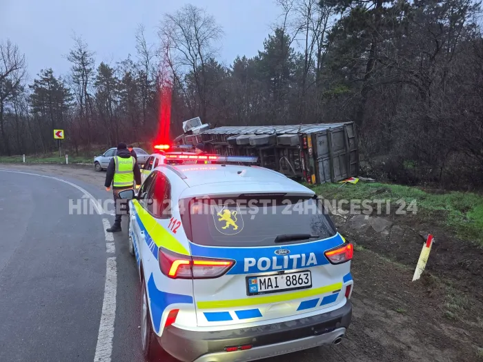 Un camion cu remorcă s-a răsturnat, astăzi, pe o șosea din Hîncești. Șoferul a fost transportat la spital.