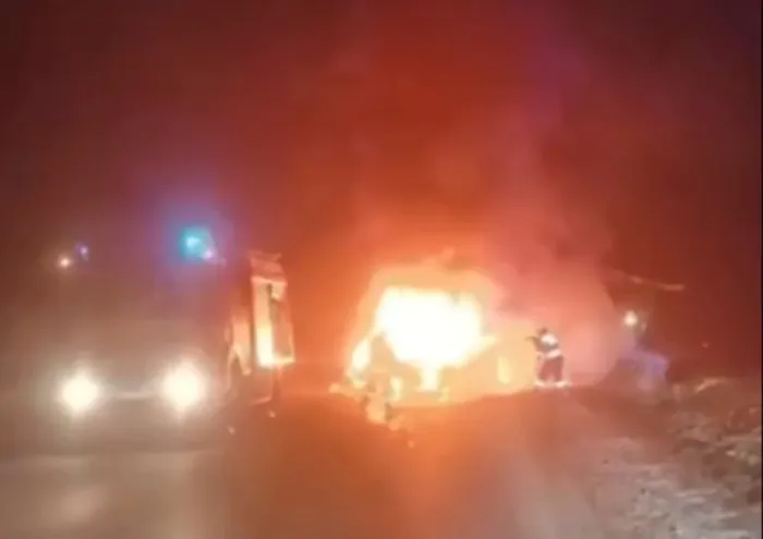 În imagini se vede automobilul care a fost cuprins în totalitate de foc. Polițiștii au stabilit preliminar că șoferul, un tânăr de 22 de ani, din motive neclare deocamdată a lovit din spate un tractor care se deplasa în aceeași direcție.