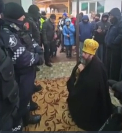 Din imaginile postate pe internet, se vede cum episcolul Petru al Mitropolie Moldovei, stă în genunchi în fața bisericii, în timp ce un cordon de polițiști baricadează intrarea.