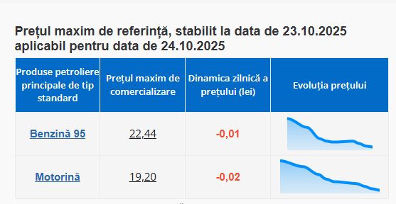 Potrivit Agenției Naționale pentru Reglementare în Energetică, mâine benzina va fi la preț de 22,44 lei pentru un litru, iar motorina va fi la preț de 19,20 lei pentru un litru.