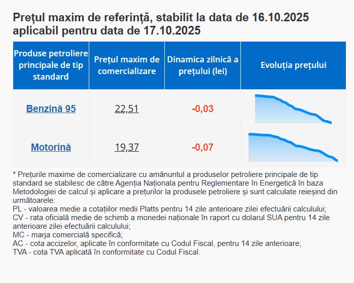 Potrivit Agenției Naționale pentru Reglementare în Energetică, mâine benzina va fi la preț de 22,51 lei pentru un litru, iar motorina va fi la preț de 19,37 lei pentru un litru.