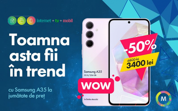 Cumpără noul Samsung A35 la un preț special de 3400 lei. Îți oferim reducere de până la 50%, în funcție de numărul de servicii contractate. Beneficiezi de 20% reducere la smartphone dacă optezi pentru un abonament de telefonie mobilă începând cu Smart 55; 35% reducere - adăugând și un abonament de Internet fix sau 50% reducere - completând cu un abonament de Televiziune. Astfel, ai toate serviciile de la un singur operator, în calitate premium și cu economii semnificative.