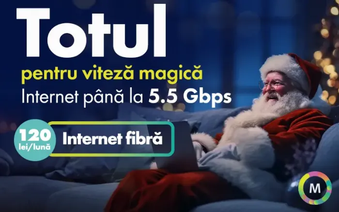 Internet fibră + TV pe 3 ecrane de la 140 lei/lună. Telefonie mobilă cu beneficii nelimitate de la 80 lei/lună. Iar cadourile — SmartTV, tabletă, smartphone sau PlayStation — doar 1 leu.