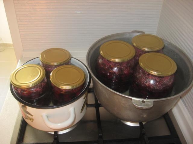 Punem capacele pe borcane, fara a le sigila deocamdata, iar borcanele le punem intr-o cratita. Umplem cratita cu apa, astfel incat nivileul acesteia sa ajunga un pic mai sus de mijlocul borcanului. Din momentul in care apa incepe sa fiarba, lasam la foc mic pentru 40 de minute. Acordam maxima atentie ca apa sa nu scada, iar daca se evapora, adaugam.