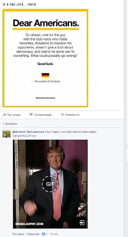 O platforma digitala globala "In the now" a publicat o parodie pe facebook, intitulata "Cum vede lumea Rusia dupa ce Donald Trump a castigat alegerile prezidentiale din SUA". Filmuletul a strans mii de vizualizari.