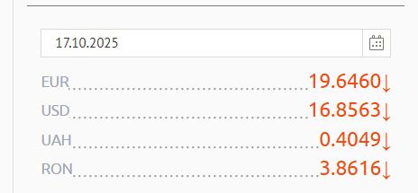 Banca Națională a Moldovei a stabilit pentru un euro un curs valutar de 19,64 lei, iar pentru un dolar 16,85 lei.