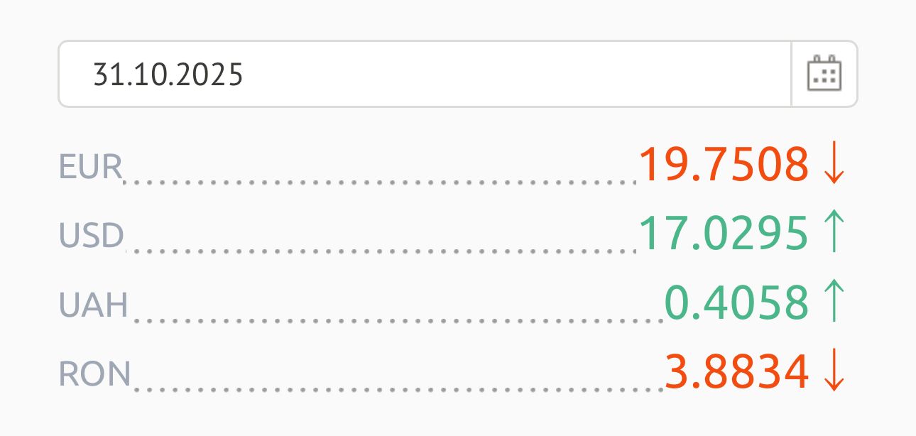 Banca Națională a Moldovei a stabilit pentru un euro un curs valutar de 19,75 lei, iar pentru un dolar 17,02 lei.