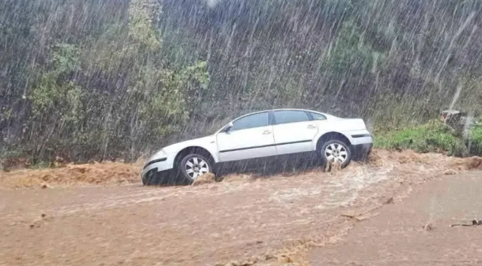 Torentul a măturat tot ce i-a stat în cale, garduri, mobilier, pietre și chiar mașini parcate. Un șofer a fost luat de ape împreună cu autoturismul, însă salvatorii au reușit repede să îl scoată.