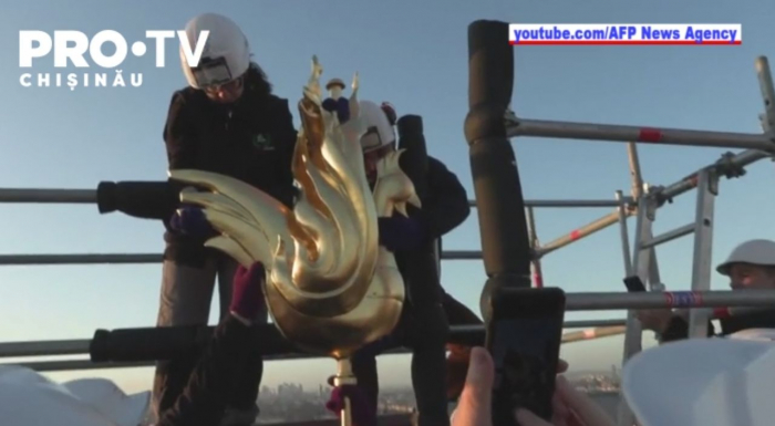 Statuia aurita a fost apoi transportata cu o macara pana in varful turlei, inalta de 96 de metri.