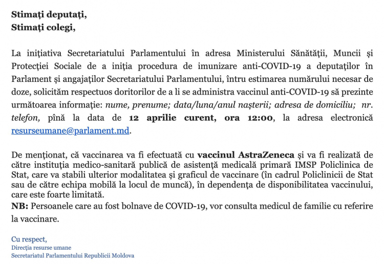 "Vaccinarea va fi realizata de catre institutia medico-sanitara publica de asistenta medicala primara IMSP Policlinica de Stat, care va stabili modalitatea si graficul de vaccinare (in cadrul Policlinicii de Stat sau de catre echipa mobila la locul de munca), in dependenta de disponibilitatea vaccinului, care este foarte limitata", se arata in mesajul secretariatului Parlamentului.