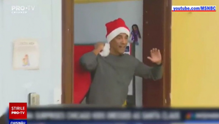 In ajunul sarbatorilor fostul lider de la Casa Alba a decis sa ii bucure pe elevi cu mai multe daruri. El a intrat pe usa strigand ca a sosit Mosul slabanog, la care copii au ras in glas.