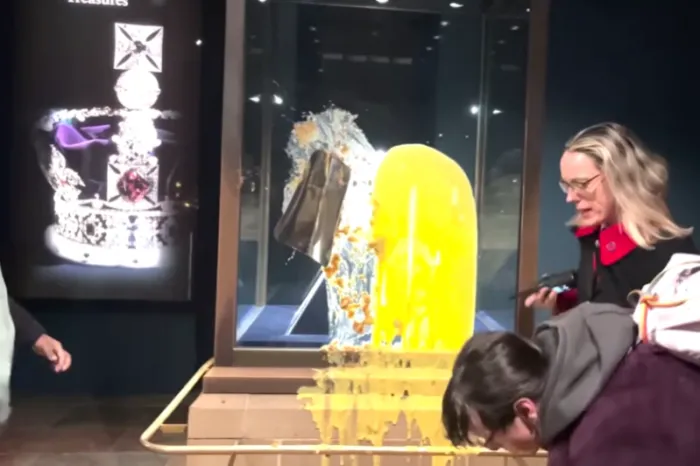 Imaginile distribuite de grup arată un manifestant cum aruncă cu putere o tavă cu plăcintă în geamul care proteja coroana. Un altul a turnat un recipient cu cremă pe fațada vitrinei.