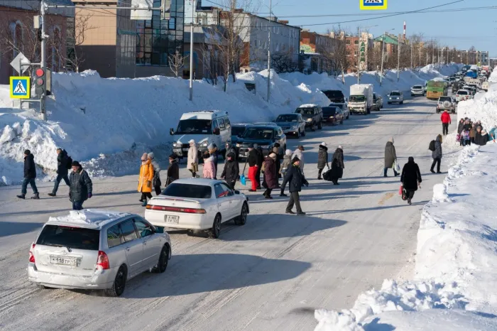 Așa circulă o parte dintre locuitorii peninsulei ruse în această perioadă, după ninsorile abundente din ultimele zile. În unele cartiere din Kamceatka, stratul de zăpadă a ajuns atât de înalt încât pietonii se deplasează la nivelul semafoarelor. În imagini se vede cum oamenii merg prin troienele formate pe marginea drumului.