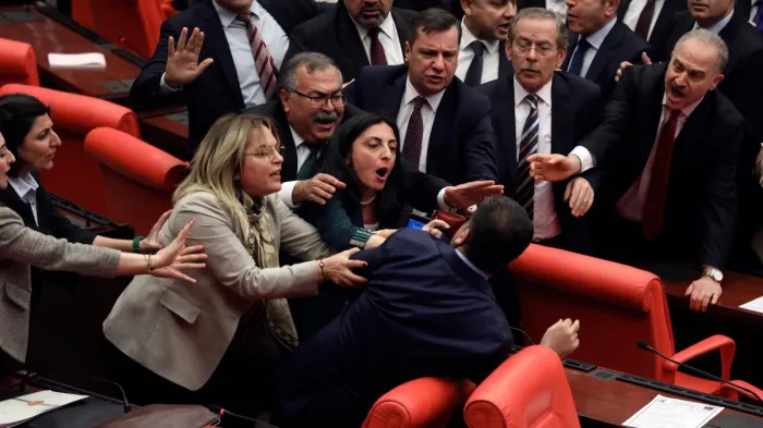 Confruntări violente au izbucnit în Parlamentul turc din Ankara, unde deputați din partea coaliției de guvernământ și a opoziției s-au luat la bătaie.