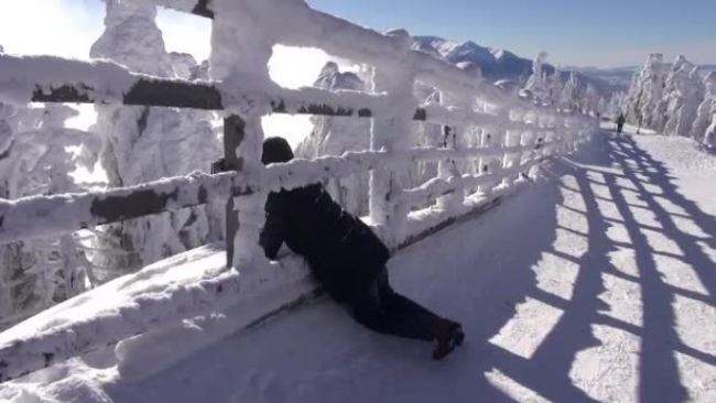 Muntele nu arata nicicând mai bine ca în aceste zile din an, iar turistii privesc înmarmuriti. Un domn din Bucuresti aproape ca a înotat prin zapada, doar-doar va reusi sa surprinda toata frumusetea si maretia muntelui.