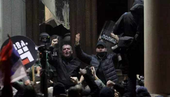 Protestatarii au spart geamurile la principala intrare a primariei din Belgrad, inainte ca politia sa foloseasca sprayuri cu piper pentru a-i dispersa in jurul orei locale 22.00 (21.00 GMT).