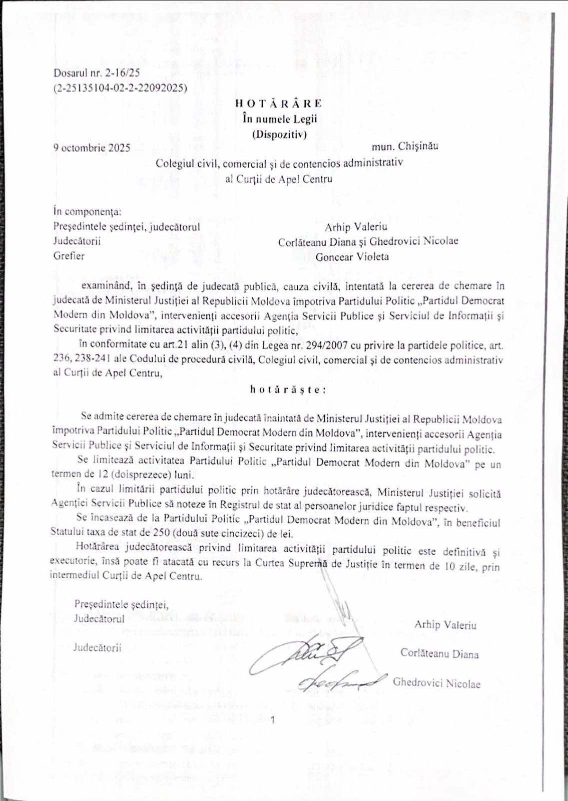 Curtea de Apel Chișinău a dispus astăzi limitarea activității Partidului Democrat Modern din Moldova, afiliat oligarhului Vlad Plahotniuc, pentru o perioadă de 12 luni. Prin această hotărâre, instanța a admis integral acțiunea înaintată de ministerul Justiției.