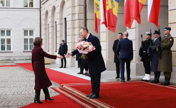 Președinta Maia Sandu se află într-o vizită oficială în Polonia. Șefa statului a fost întâmpinată cu flori de omologul său, președintele Karol Nawrocki, la Palatul Prezidențial din Varșovia.