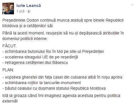 Fostul premier Iurie Leanca a reactionat ironic, mentionand ca Dodon a reusit pana acum sa nu-si depaseasca atributiile in domeniul politicii interne, prin schimbarea limbii pe site-ul presedintiei, scoaterea drapelului Uniunii Europene sau retragerea cetateniei lui Basescu.