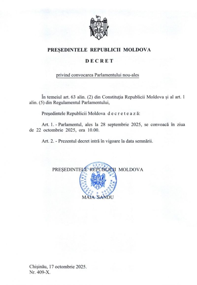 Potrivit documentului, prima ședință a noului Legislativ va avea loc miercuri, 22 octombrie 2025, începând cu ora 10:00. În cadrul ședinței inaugurale, noii deputați urmează să aleagă organele de conducere și de lucru ale Parlamentului, inclusiv președintele legislativului, vicepreședinții și membrii Biroului permanent.