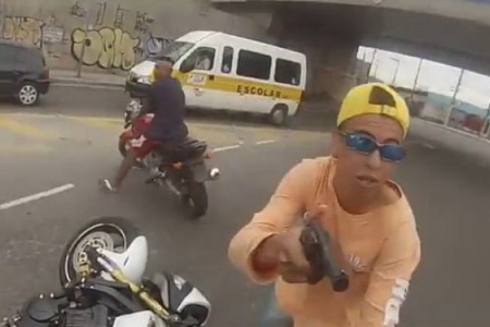 In imagini se vede cum un motociclist opreste la o intersectie, iar apoi se trezeste cu un pistol in fata, dupa ce doi tineri aflati pe o alta motocicleta opresc in fata lui.