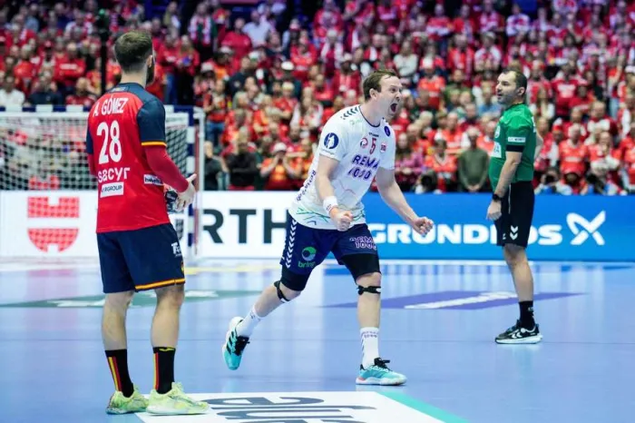 Iar vecina Norvegia a obținut și ea o victorie dramatică împotriva Spaniei. Doar câștigătoarea acestui meci de deschidere din Herning avea șanse reale să rămână în cursa pentru semifinale, așa că miza era uriașă pentru ambele echipe. Scandinavii au intrat în ultimele 60 de secunde cu posesia și scorul egal, 34 la 34. Dar Tobias Grondahl a fost decisiv și a marcat cu 32 de secunde înainte de final, în timp ce poarta Norvegiei era goală.