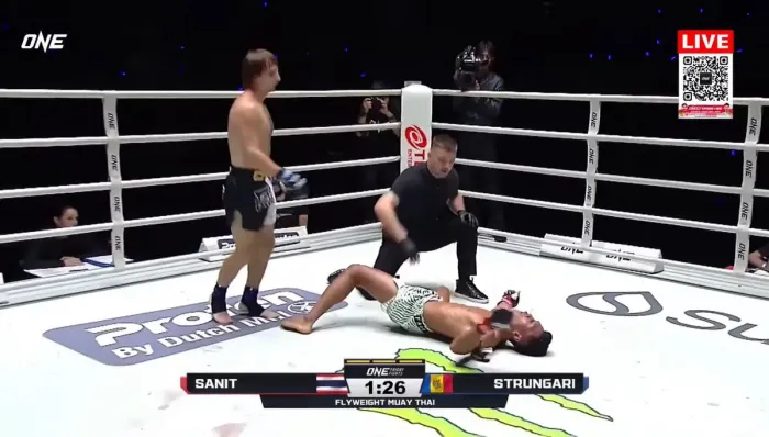 Valerii Strungari și-a năucit adversarul cu o serie de lovituri de mâna stângă în cap. Thailandezul Sanit Aekmuangnon s-a prăbușit și nu a mai putut continua bătălia, desfășurată în baza regulilor muay thai. Strungari a reușit knockout-ul la jumătatea rundei a treia.