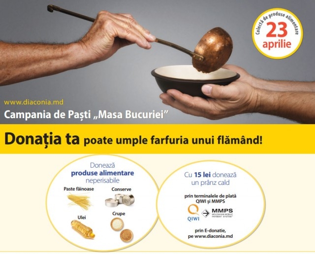 Cei care nu au reusit astazi sa doneze produsele in centrele comerciale, pot contacta direct misiunea Diaconia sau pot face donatii financiare on-line. Campania Masa Bucuriei se desfasoara pentru al saptelea an consecutiv inainte de Pasti.