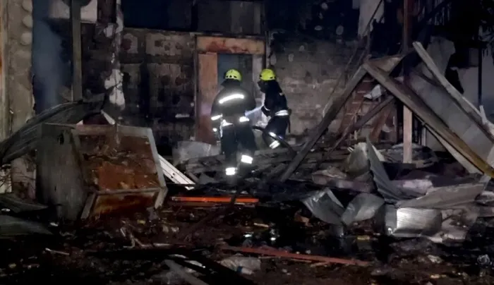Imaginile publicate de pompieri arată un foc insens și dărâmături la clădirea atacată, iar în curte s-a format un crater de foc după ce o bucată de dronă a căzut.