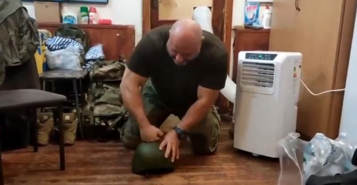 Un militar ucrainean pare ca vrea sa arate tuturor cum se comporta o casca a unui soldat rus in momentul in care este lovita de un corp contondent, dar un in loc sa foloseasca ceva mai serios, o loveste doar cu pumnii de cateva ori.