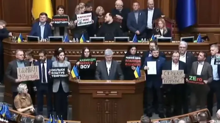Ședința în cadrul căreia deputații trebuiau să examineze demisia lui Gherman Galușchenko, implicat într-un caz de corupție în domeniul energiei, din funcția de ministru al justiției, precum și a Svetlanei Grinchuk, din funcția de ministru al energiei, s-a lăsat cu scandal.